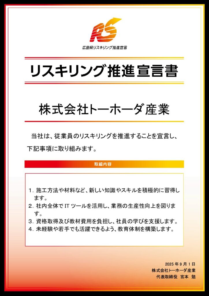 2025年9月1日 株式会社トーホーダ産業では、添付のとおり従業員のリスキリングを推進いたします。従業員の学ぶ意欲をサポートすることで、幅広い知識をもった人材の育成に取り組みます。