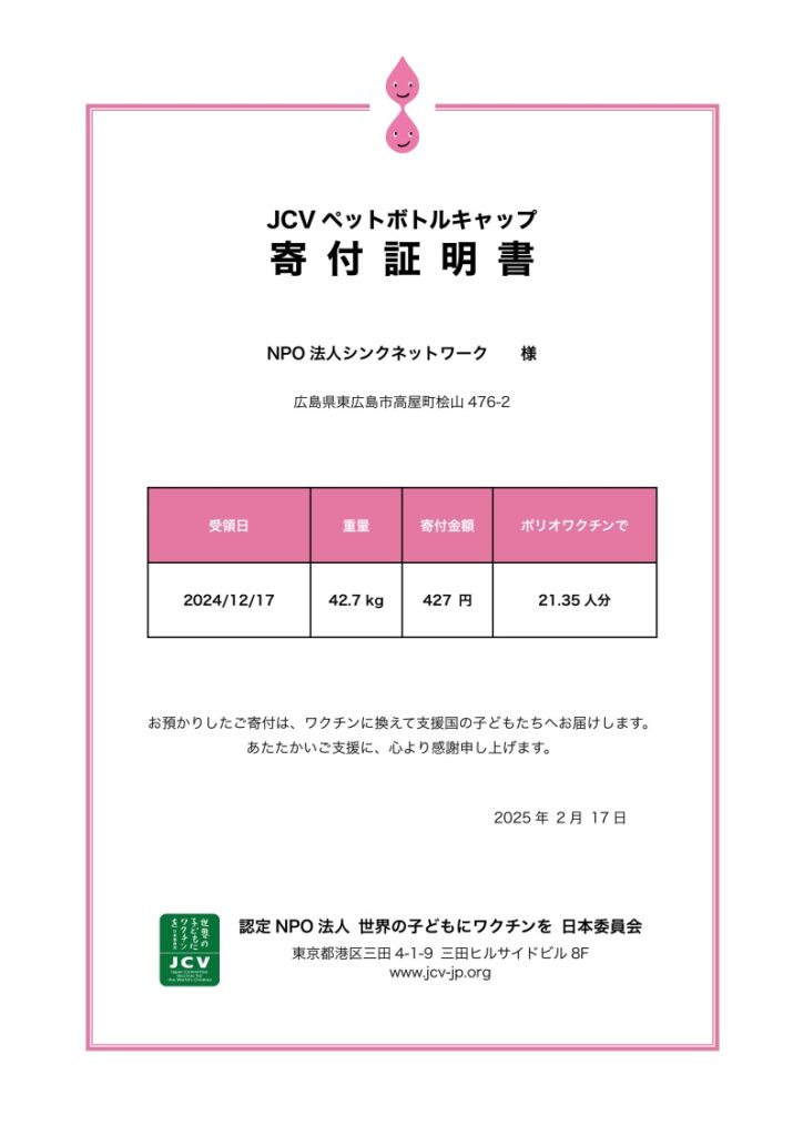 この度、2024年12月にグループ全体で集約したキャップの寄付が完了し、認定NPO法人「世界の子どもにワクチンを 日本委員会(JCV)」より寄付証明書をいただきました 。